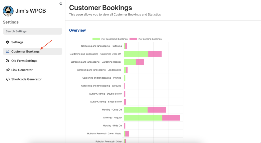 In this chapter, we explore the functionality that allows you to view customer booking statistics on the Customer Bookings page. This feature provides insights into the performance of your services, showing the number of successful and pending bookings for each service.