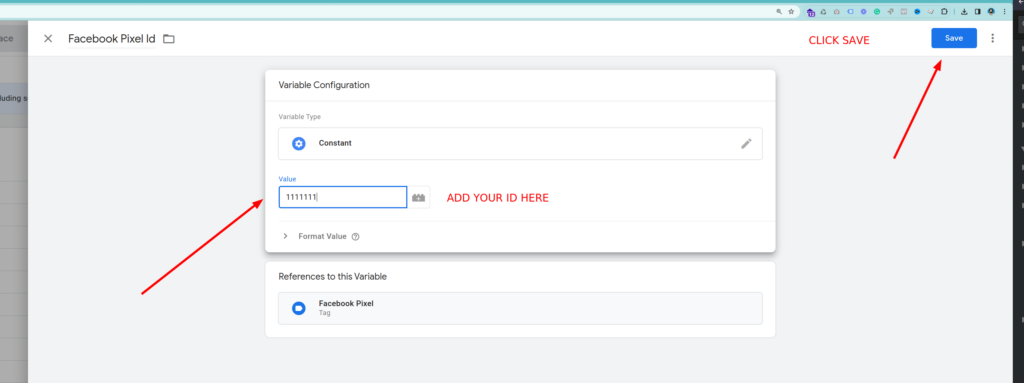 Please locate the variable and replace the existing Facebook Pixel ID with your own.