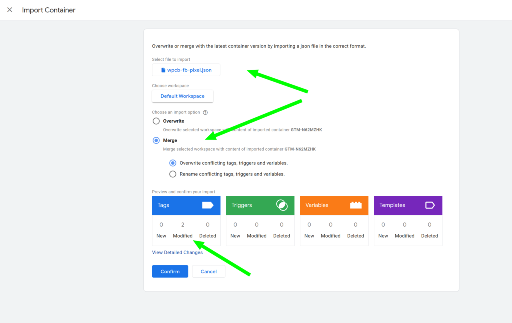 If, for instance, you’ve previously set up a Tag for PageViews in this account, consider merging it rather than renaming. After importing, you can assign the configuration to the cb3 events.