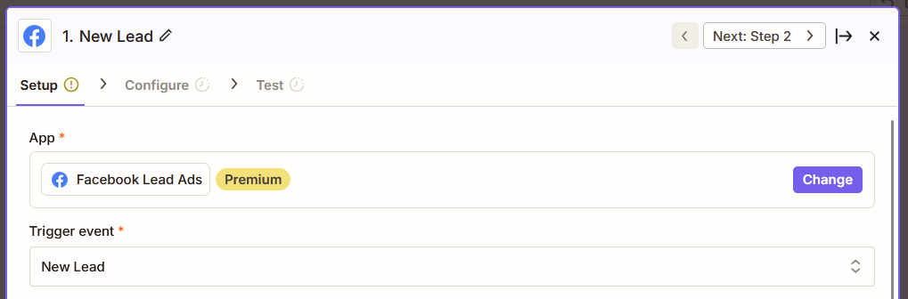 2.2. The Facebook Leads Ad step should be configured with “New Lead” as the trigger event