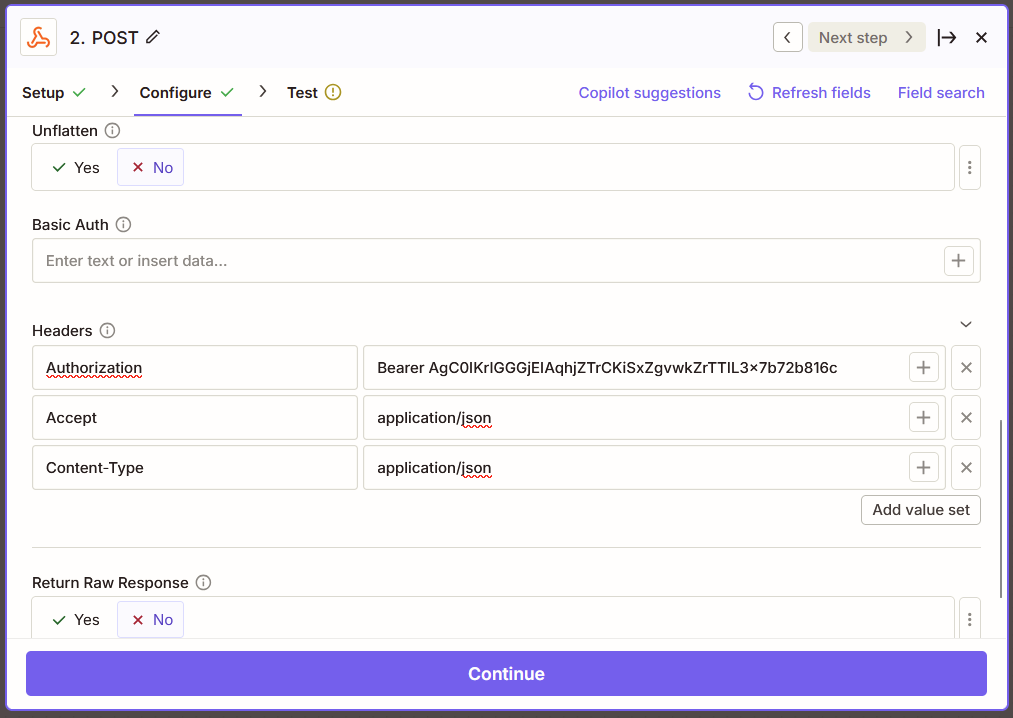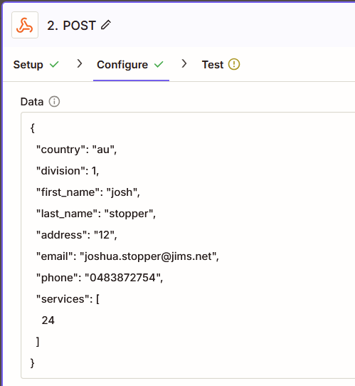 2.6: Congure the Data for the POST with the following template, and update the values with variables from Zapier with the data from Facebook data.