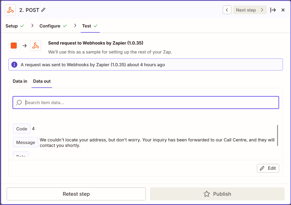 2.8: On the final screen of the Webhook step, you can test the integration with FMS.